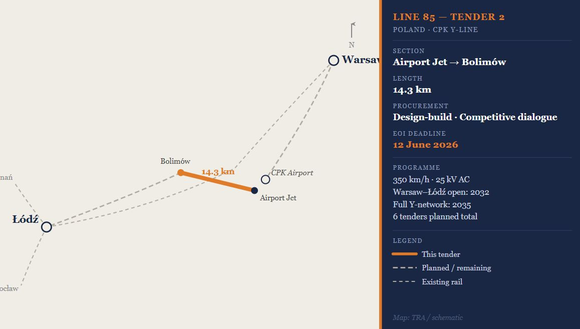 The procurement, announced 24 April, covers a 14.3 km section between the Airport Junction and Bolimów on Line 85, the Warsaw–Łódź corridor, and will run as a competitive dialogue with expressions of interest due by 12 June.