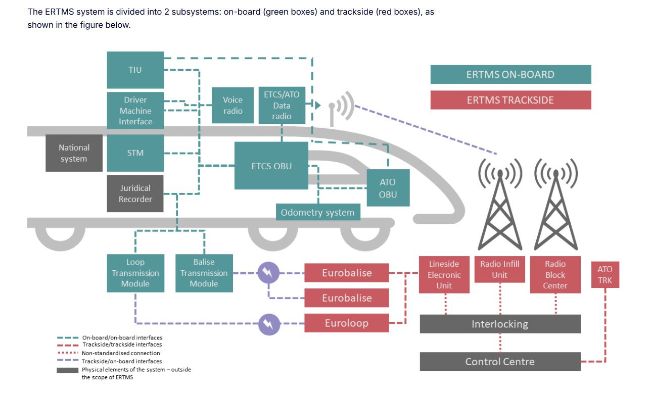 ERTMS is Europe’s common digital train-control system. It integrates on-board supervision, radio communication and trackside logic in one standard architecture to improve safety, reduce national divergence and support higher-capacity cross-border operations.